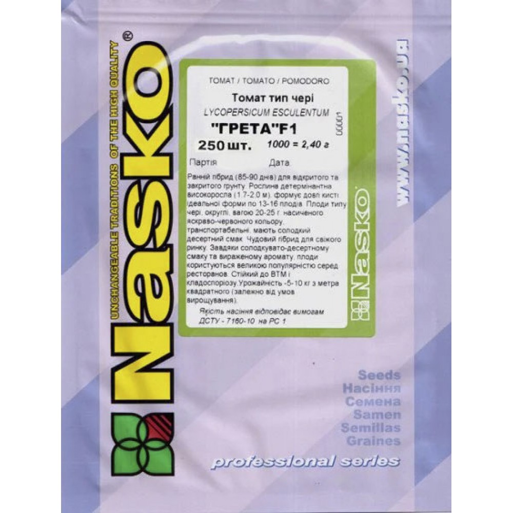 Плоды по типу чери – округлые, небольших размеров, весом 20-25 г, насыщенного алого цвета, транспортабельные. Различаются сладким десертным вкусом. Прекрасный томат-чери для свежего рынка. Плоды используются для свежего потребления, консервирования и декоративного оформления различных блюд. Благодаря непревзойденному сладковато-десертному вкусу и выраженному аромату плоды имеют большую популярность для ресторанов. Устойчив к ВТМ и кладоспориозу. Урожайность гибрида составляет 5-10 кг/м2 (в зависимости от условий выращивания). Рекомендуем выращивать гибрид Грета F1 как в открытом, так и в закрытом грунте.